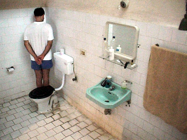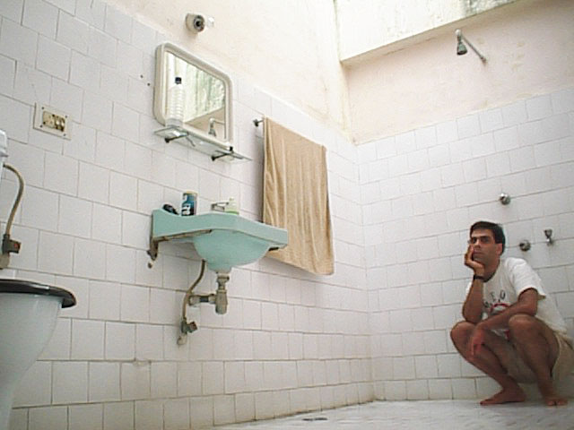 Room 17 contains the usual amenities: a small couch, two beds with netting, a nightstand with telephone and lamp, two small desks with chairs, assorted light fixtures, a mirror, a picture on the wall, and a ceiling fan; in addition, this room is one of the few equipped with an air conditioner/clothes drier. The private bathroom deserves its own paragraph, below. Last but not least, there is a large balcony facing Powai lake.