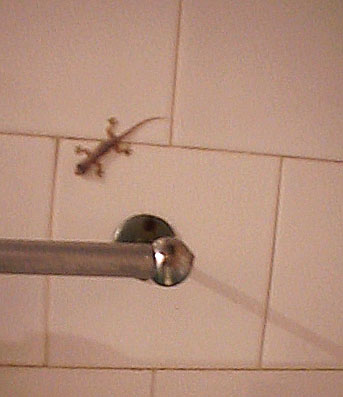 The bathroom is the greatest, and not only in size (which together with the tiling and sparseness reminds me of the gang showers of my rowing club in Argentina). It is a good space, and preferred home for my roommate the little lizard.