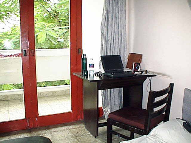 The room is also very suitable to get work done: the phone line is easy to plug into the modem, there's a desk, airconditioning and ceiling fan, and a view...